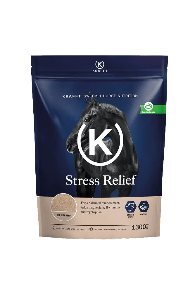 KRAFFT Stress Relief Support is a well-formulated dietary supplement for horses containing tryptophan, magnesium, and B vitamins, which may help balance the horse's temperament in stressful situations.