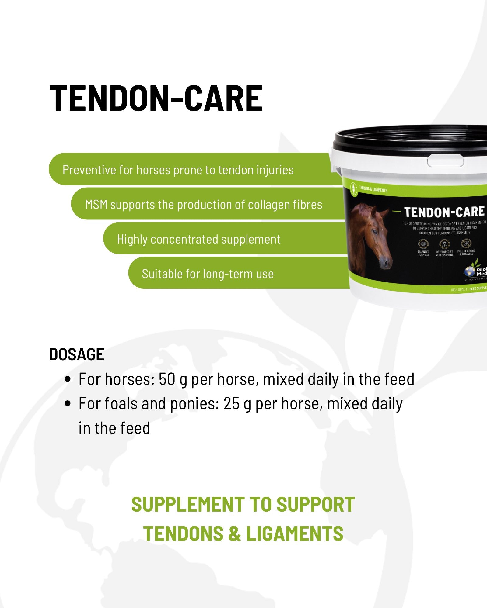 Tetive i ligamenti imaju vrlo slabu prokrvljenost u usporedbi s mišićima. Zbog tog smanjenog dotoka krvi, hranjive tvari sporije pristižu, a otpadni produkti se sporije uklanjaju, što rezultira dugotrajnijim oporavkom. Tendon-Care je dodatak za konje koji potiče oporavak od ozljeda tetiva i ligamenata. Radi se o visoko koncentriranom proizvodu koji podupire njihovo zdravlje, pa se može primjenjivati i preventivno radi sprječavanja ozljeda.