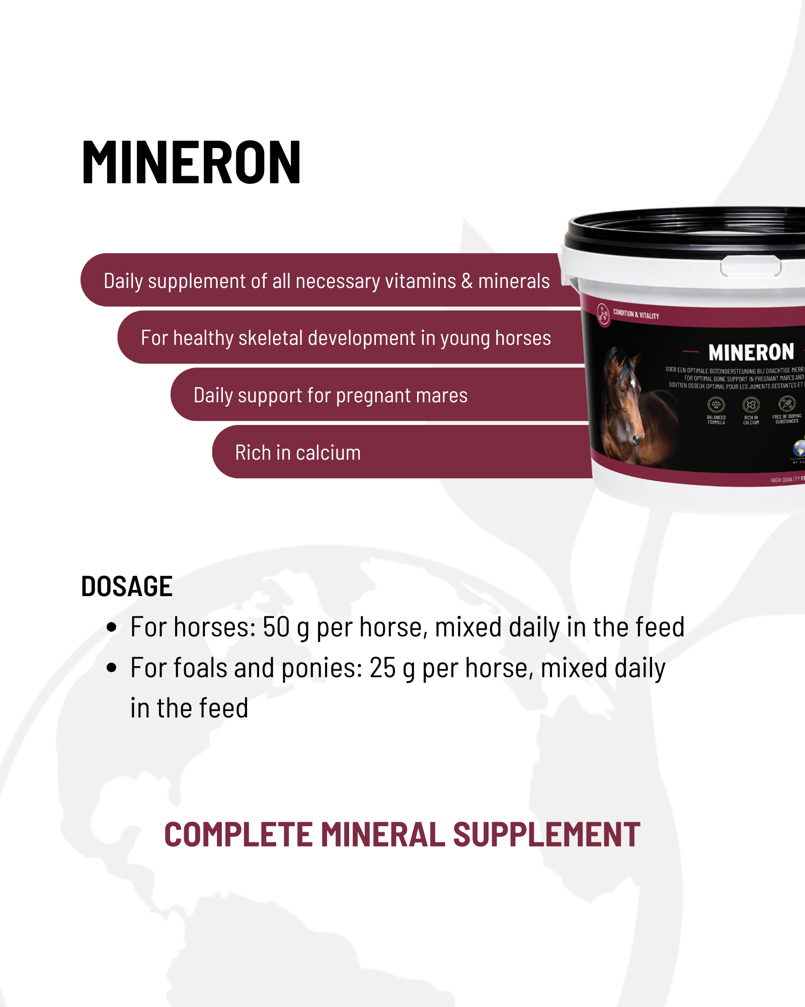 Mineron se može koristiti kod odraslih konja kao osnovni, svakodnevni izvor vitamina za održavanje zdravlja. Osim toga, preporučuje se tijekom razdoblja stresa, visoke aktivnosti, graviditeta ili oporavka od bolesti ili operacije. Kod mladih konja pruža potporu tijekom razvoja kostura. Konji koji se hrane isključivo sijenom putem Minerona dobivaju sve potrebne vitamine, minerale i elemente u tragovima kako bi ostali u vrhunskoj kondiciji.